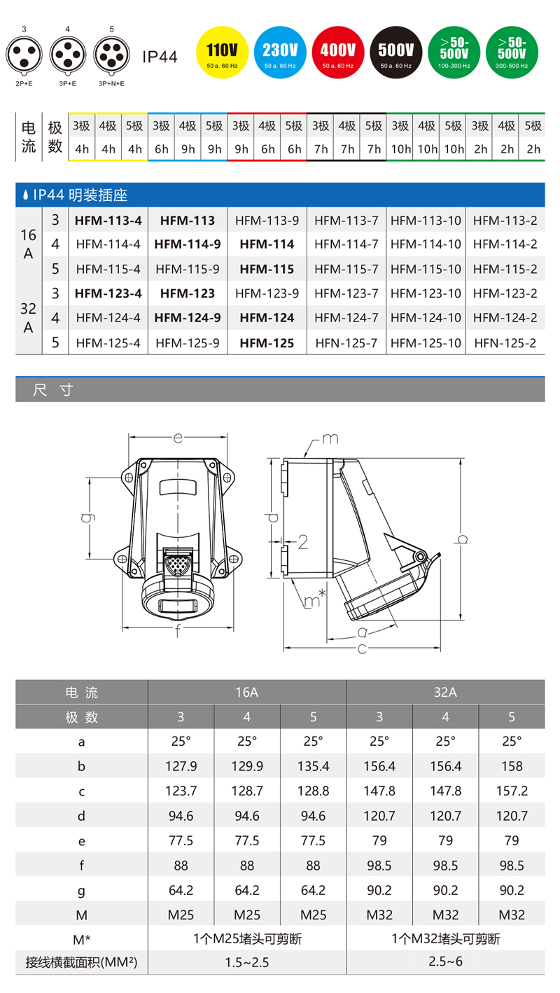 3孔16A工业插座HFM113 3孔32A明装工业插座HFM123 HFE禾丰
