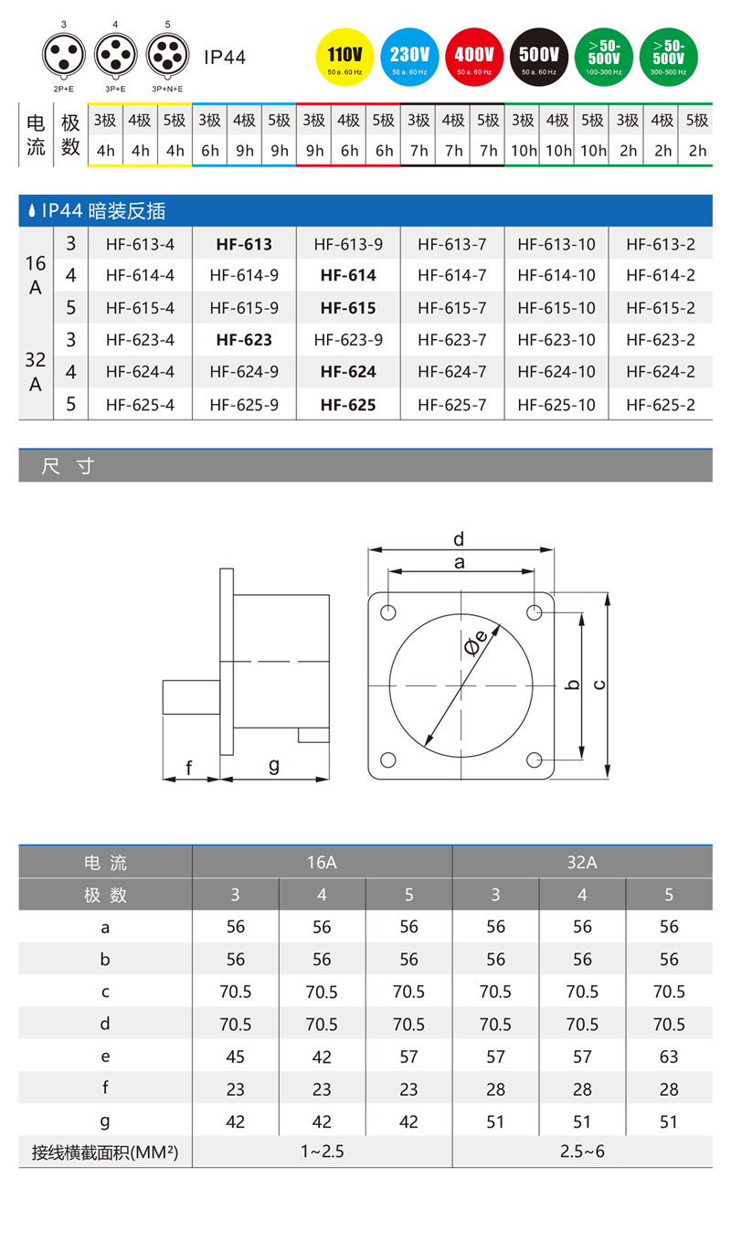 HF613 3芯16A暗装工业插头 HF623 3芯32A器具反装插头