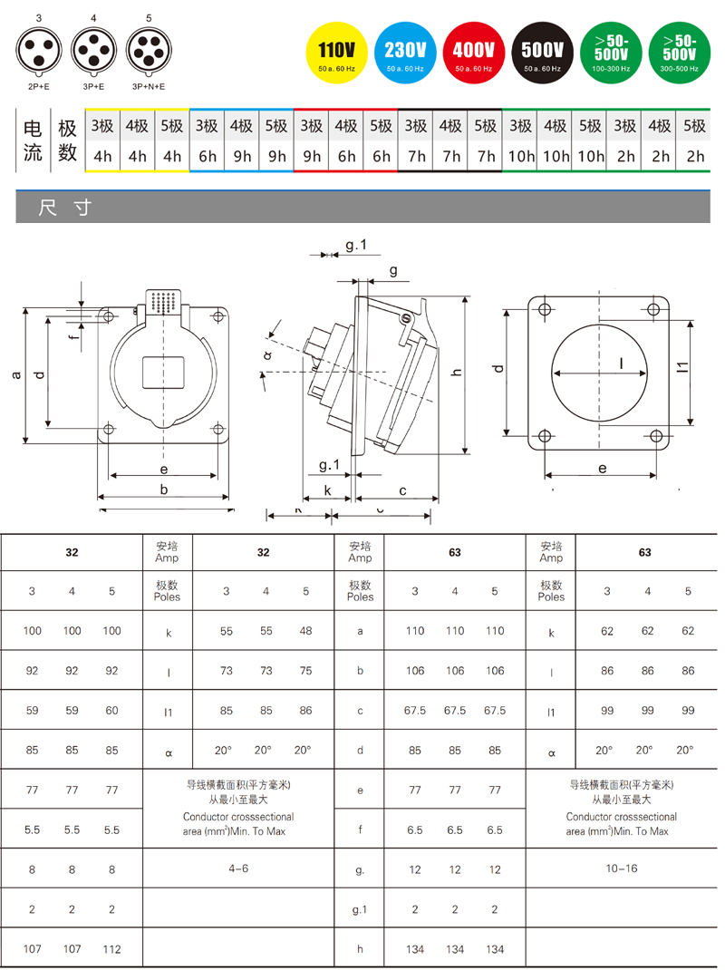 HFE禾丰4孔63A暗装斜式工业插座HFM434 3P+E 380V IP44