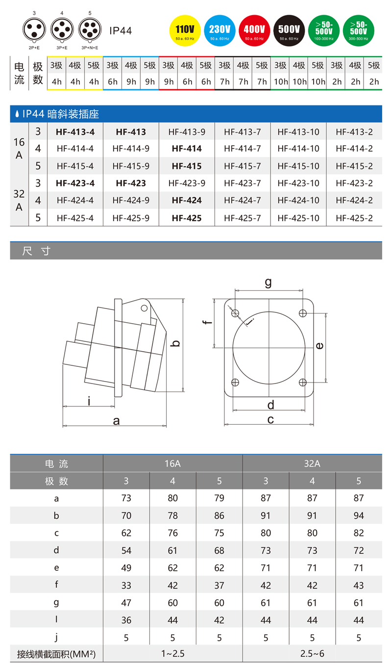 HF415 5孔16A暗装斜面板插座 HF425 5孔32A暗装工业插座