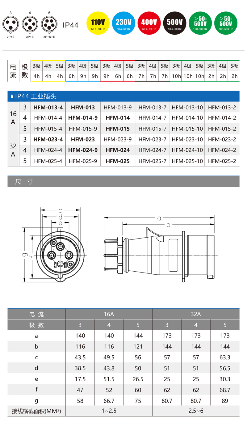 3芯16A工业插头HFM013 3芯32A工业插头HFM023 IP44 HFE禾丰
