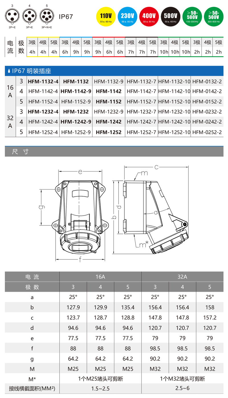 HF1242-3h船用明装工业插座 4孔32A冷藏箱墙壁固定工业插座 440V 3H