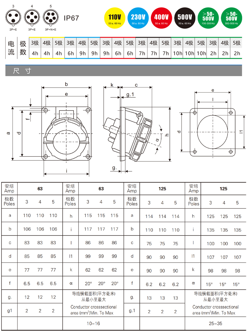 HFE禾丰4孔63A暗装斜式工业插座HFM4342 3P+E 380V IP67
