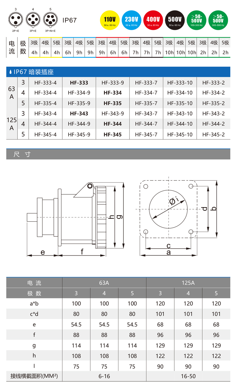 HF334 4孔63A暗装工业插座 HF344 4孔125A电源箱面板插座