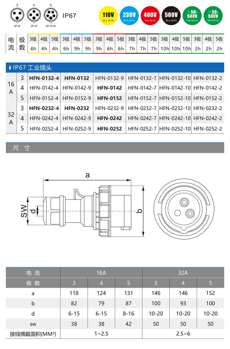 HFN0242-3H冷藏箱用工业插头 4芯32A 3H IP67防水插头