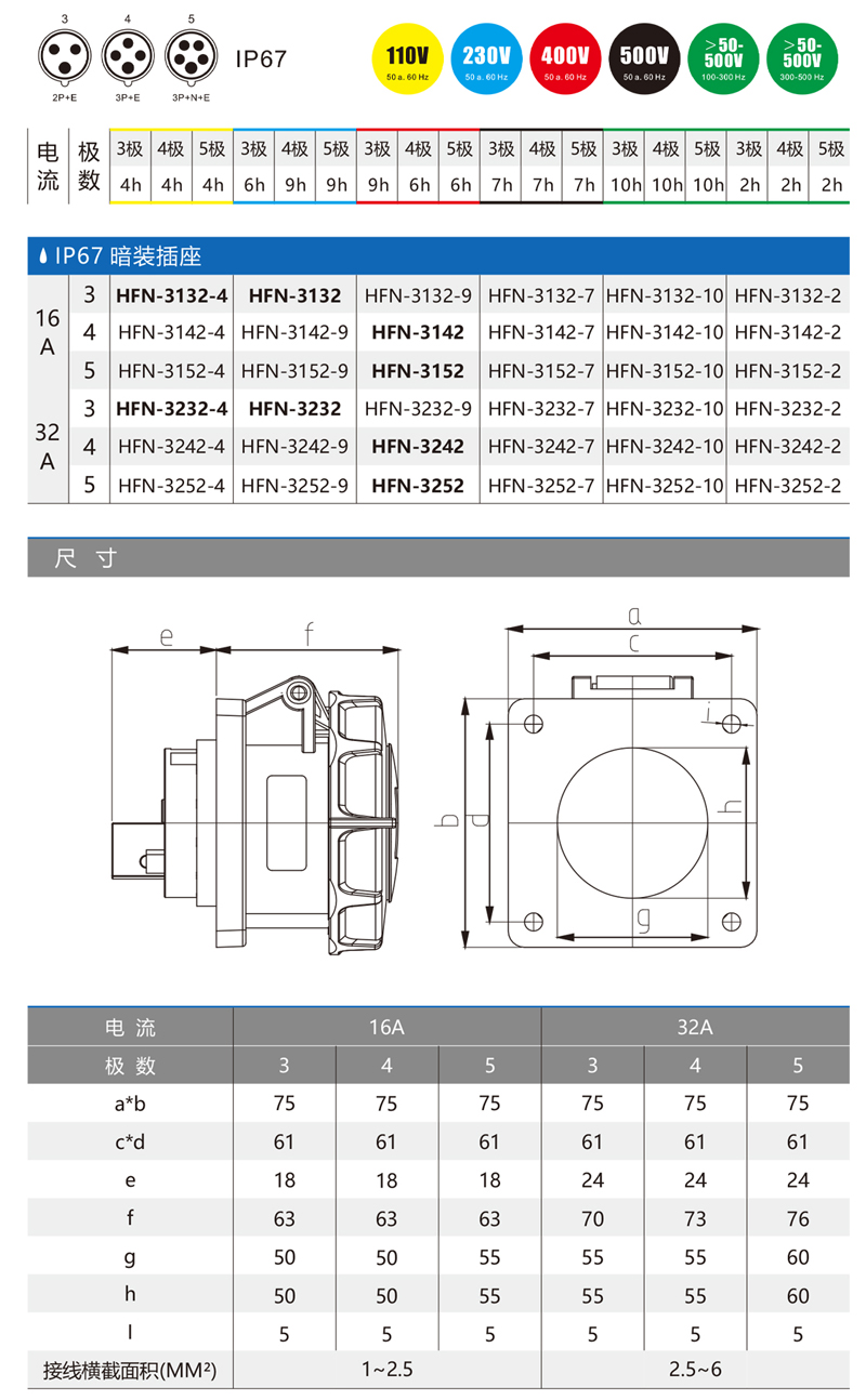 HFN3132 3孔16A工业防水插座 HFN3232 3孔32A插座箱暗装插座