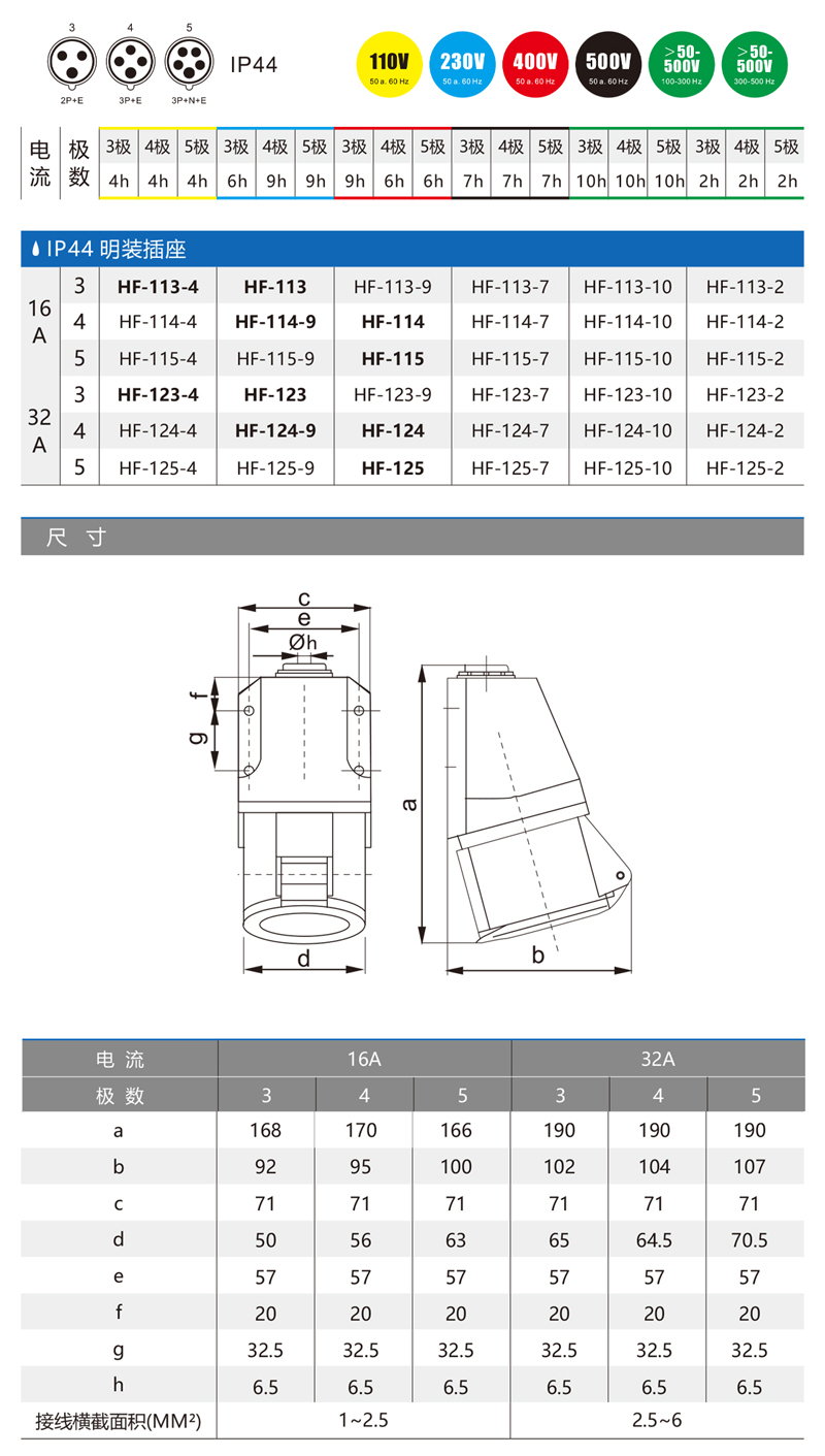 HF114 4孔16A明装工业插座 HF124 4孔32A固定式工业插座