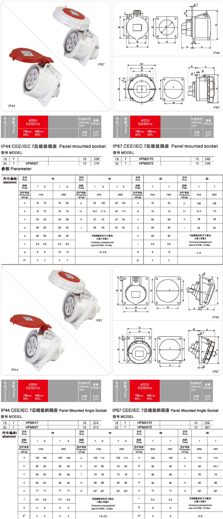 HFE禾丰7孔16A工业插座 IP44暗装斜式面板插座HFM417