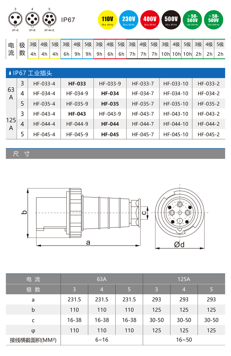 HF035 5芯63A防水工业插头 HF045 5芯125A禾丰工业插头