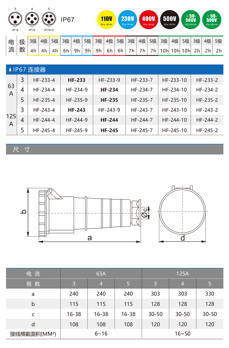 HF233 3孔63A连接器插座 HF243 3孔125A连接器母插头