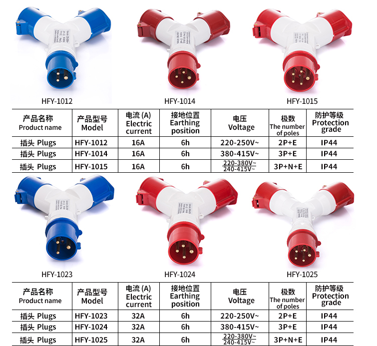 HF1014Y 4芯16A一进二出多功能插座 HF1024Y 4P32A多出头Y型插座